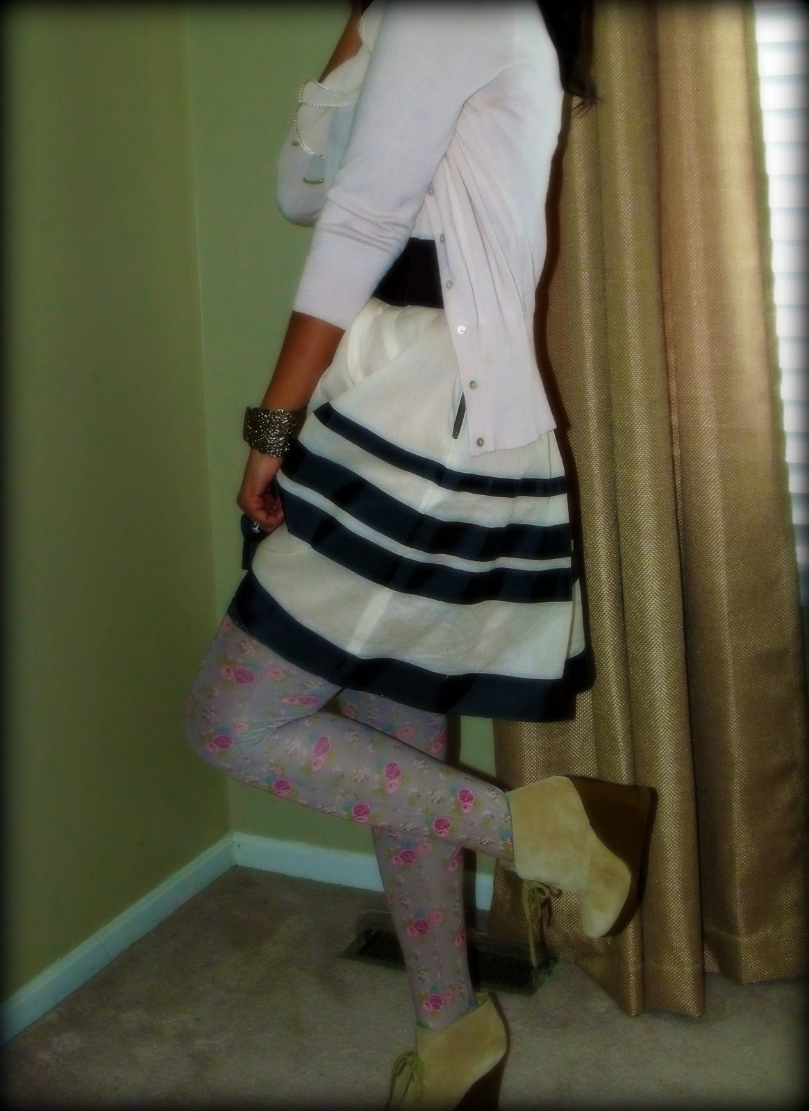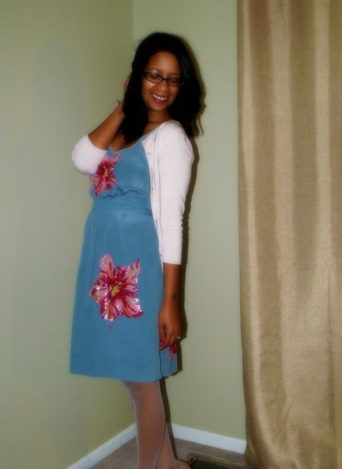 details:dress-glimmering magnolia-antho/cardi-express/fishnets-kohl's/shoes-steve madden