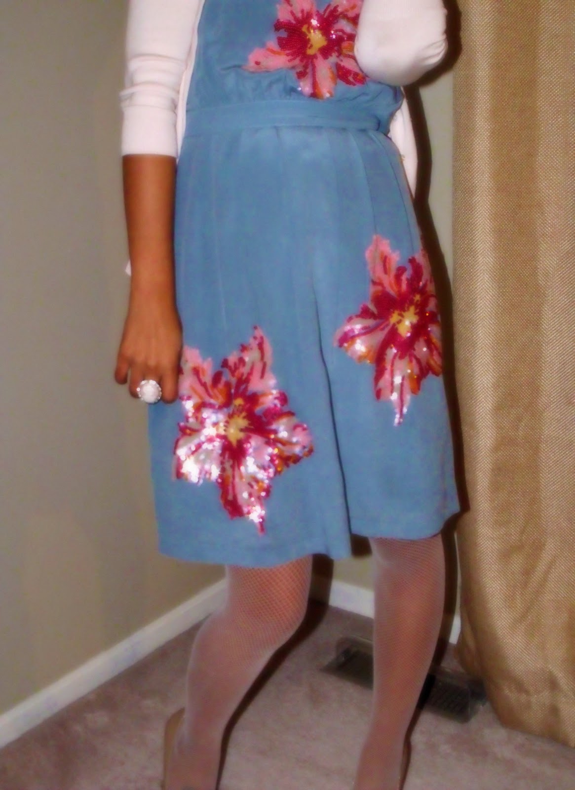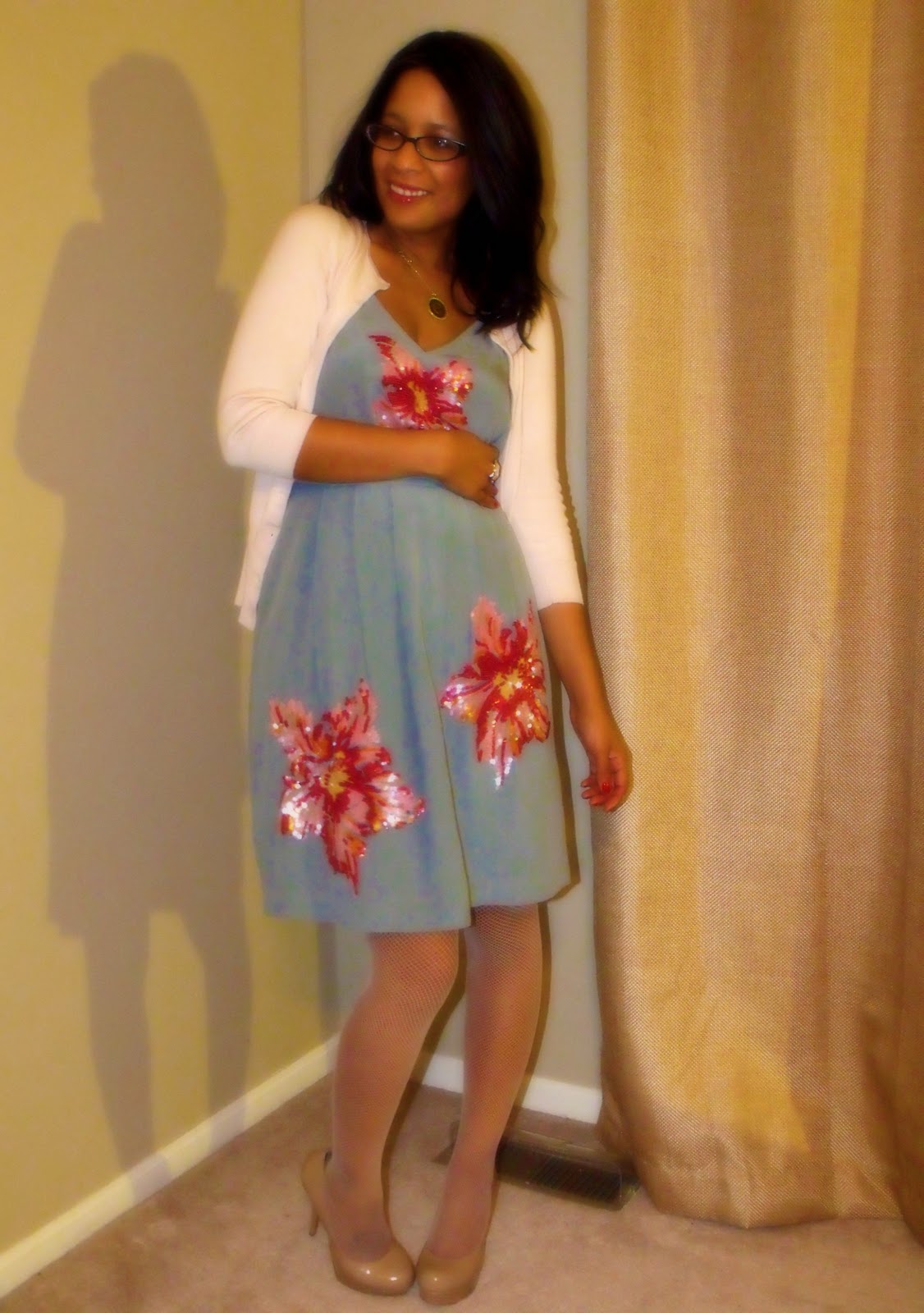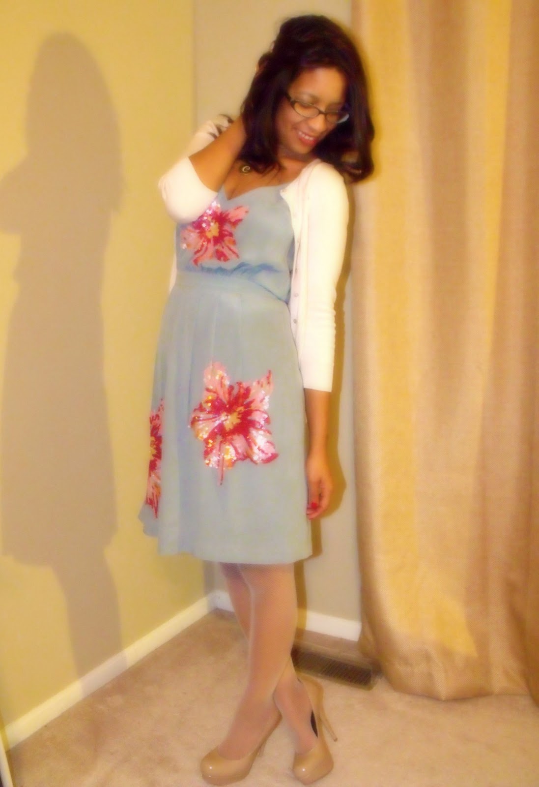details:dress-glimmering magnolia-antho/cardi-express/fishnets-kohl's/shoes-steve madden