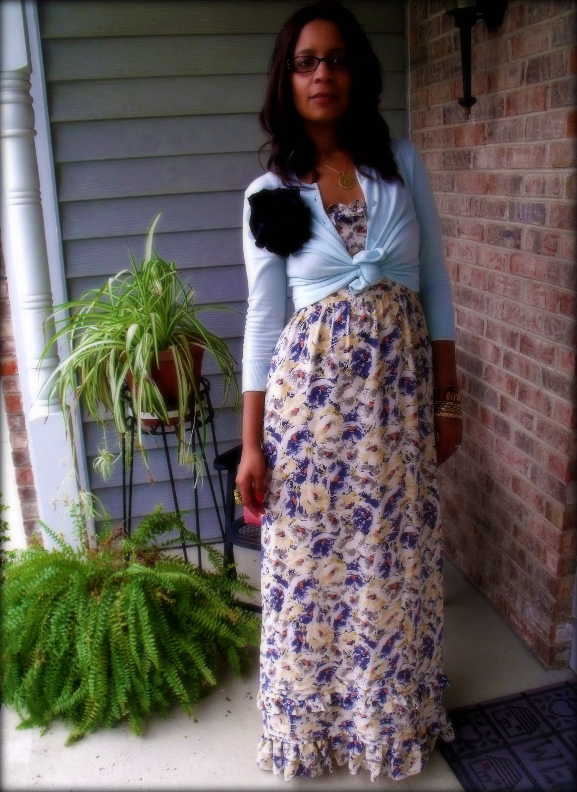 wearing: anthro maxi dress/j crew cardigan/limited flower pin